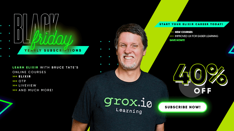 An annual Grox.io subscription is 40% off and unlocks Bruce’s entire course library, covering OTP, LiveView, LiveBook, Nerves, and more. Level up your skills with engaging, project-based learning. Last days!